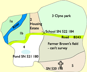 Make a sketch map below of the whole area surveyed giving a 6 fig grid reference for your school and at least 2 other locations in the total area, e,g, a church or pond.